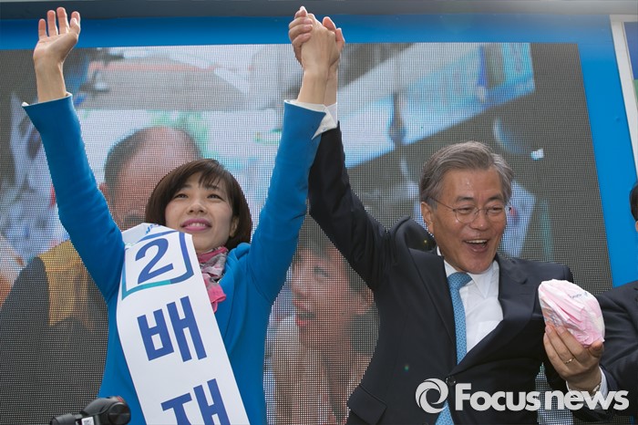 (부산=포커스뉴스) 문재인(오른쪽 두번째) 전 더불어민주당 대표가 11일 오후 부산시 사상구 가야대로 주례럭키아파트 앞에서 배재정(왼쪽) 더불어민주당 사상 후보 지원유세에 참석해, 한 시민으로부터 기저귀를 받고 당황스러워하고 있다.