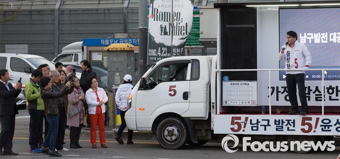 (인천=포커스뉴스) 20대 총선을 이틀 앞둔 11일 오후 인천 남구 제물포역 앞에서 윤상현 무소속 남구을 후보가 유권자에게 지지호소 하고 있다.