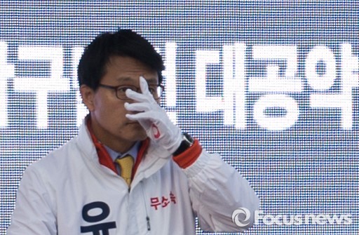 (인천=포커스뉴스) 20대 총선을 이틀 앞둔 11일 오후 인천 남구 제물포역 앞에서 윤상현 무소속 남구을 후보가 지지호소 전 안경을 고쳐쓰고 있다.