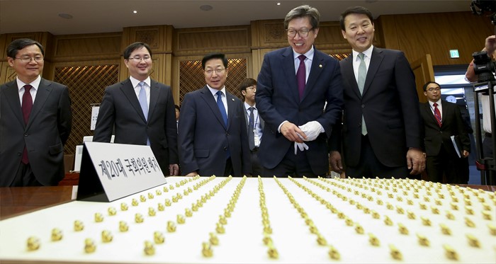(서울=포커스뉴스) 20대 총선을 이틀 앞둔 11일 서울 여의도 국회에서 열린 20대 국회 개원종합지원실 개소식에 참석한 박형준(왼쪽 다섯번째) 국회 사무총장 등 내빈들이 20대 국회의원들에게 지급될 배지를 살펴보고 있다. <사진제공=국회>