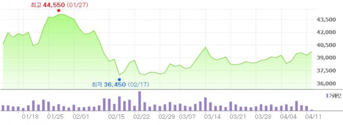 그는 "연간 매출액은 2251억원, 영업이익 284억원으로 전년 대비 각각 17%, 30% 증가할 것으로 추정된다"고 덧붙였다.최근 3개월간 YG엔터테인먼트 주가 추이 <그래픽출처=네이버>
