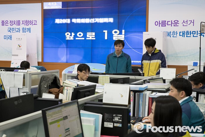 (과천=포커스뉴스) 2016 제20대 국회의원선거를 하루 앞둔 12일 오전 경기도 과천시 중앙선거관리위원회에 설치된 상황실에서 직원들이 업무를 보고 있다.