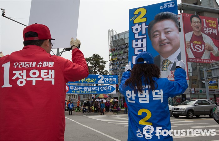 (청주=포커스뉴스) 국회의원 선거를 하루 앞둔 12일 오전 충북 청주 상당구 육거리시장 앞에서 새누리당 정우택 후보, 더불어민주당 한범덕 후보의 선거운동원들이 지지를 호소하고 있다.