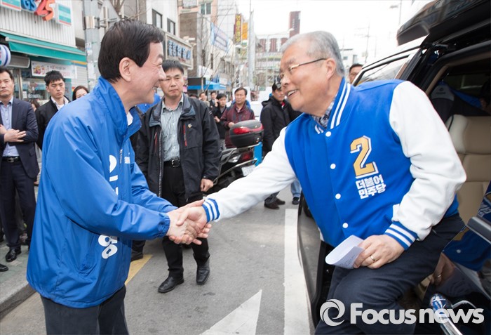 (서울=포커스뉴스) 2016 제20대 국회의원선거를 하루 앞둔 12일 오후 서울 용산구 후암시장 인근에서 김종인 더불어민주당 비대위 대표 겸 선대위원장과 진영 서울 용산구 후보가 악수를 하고 있다.