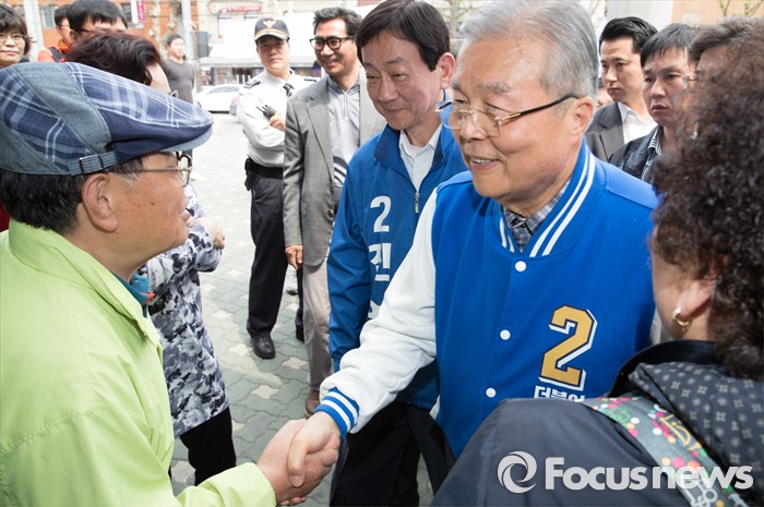 (서울=포커스뉴스) 2016 제20대 국회의원선거를 하루 앞둔 12일 오후 서울 용산구 후암시장 인근에서 김종인 더불어민주당 비대위 대표 겸 선대위원장과 진영 서울 용산구 후보가 유권자들에게 지지를 호소하고 있다.