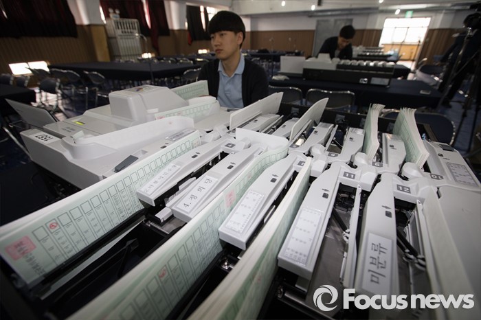(서울=포커스뉴스) 4.13총선을 하루 앞둔 12일 오후 서울 영등포구 여의도고등학교 체육관에 마련된 개표소에서 선관위 관계자들이 투표지분류기를 점검하고 있다.