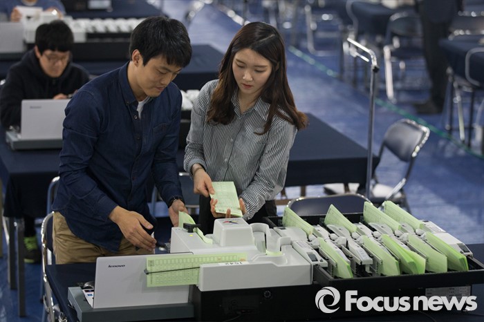(서울=포커스뉴스) 4.13총선을 하루 앞둔 12일 오후 서울 영등포구 여의도고등학교 체육관에 마련된 개표소에서 선관위 관계자들이 투표지분류기를 점검하고 있다.