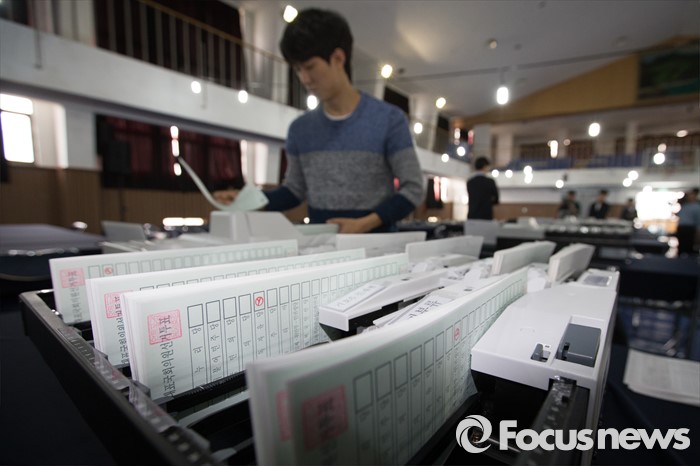 (서울=포커스뉴스) 4.13총선을 하루 앞둔 12일 오후 서울 영등포구 여의도고등학교 체육관에 마련된 개표소에서 선관위 관계자들이 투표지분류기를 점검하고 있다.
