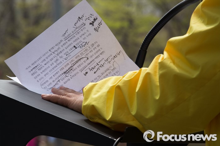 (고양=포커스뉴스) 제20대 국회의원 선거를 하루 앞둔 12일 오후 심상정 정의당 고양갑 후보가 경기 고양시 롯데마트 화정점 앞에서 '국민들께 드리는 글'을 발표하고 있다.