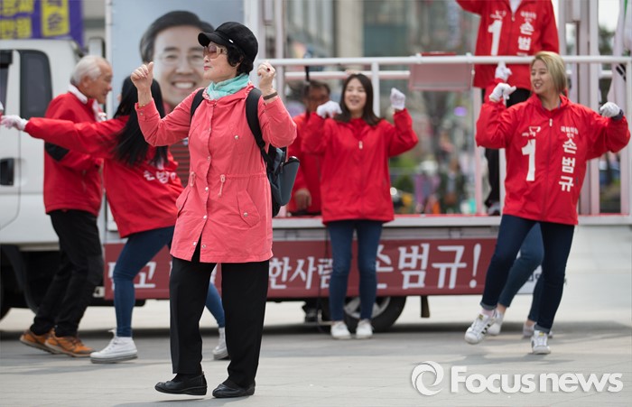 (고양=포커스뉴스) 제20대 국회의원 선거를 하루 앞둔 12일 오후 경기도 고양시 화정역 앞에서 손범규 새누리당 고양갑 후보 선거운동원들과 지지자들이 로고송에 맞춰 춤을 추고 있다.