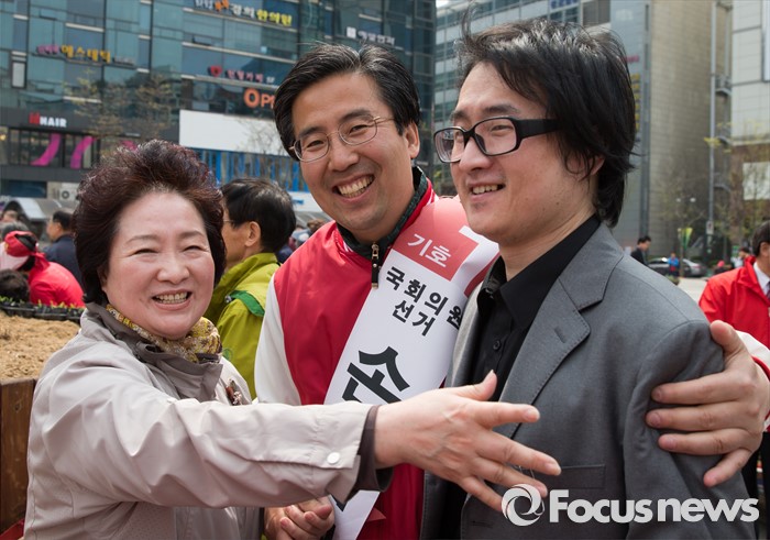 (고양=포커스뉴스) 제20대 국회의원 선거를 하루 앞둔 12일 오후 경기도 고양시 화정역 앞에서 손범규 새누리당 고양갑 후보가 지지자들과 인사하고 있다.