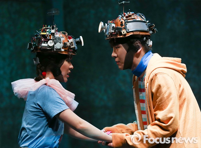 (서울=포커스뉴스) 12일 오후 서울 종로구 아트원씨어터에서 열린 연극 '지구를 지켜라' 프레스콜에 참석한 배우 함연지(왼쪽), 키가 주요장면을 시연하고 있다.