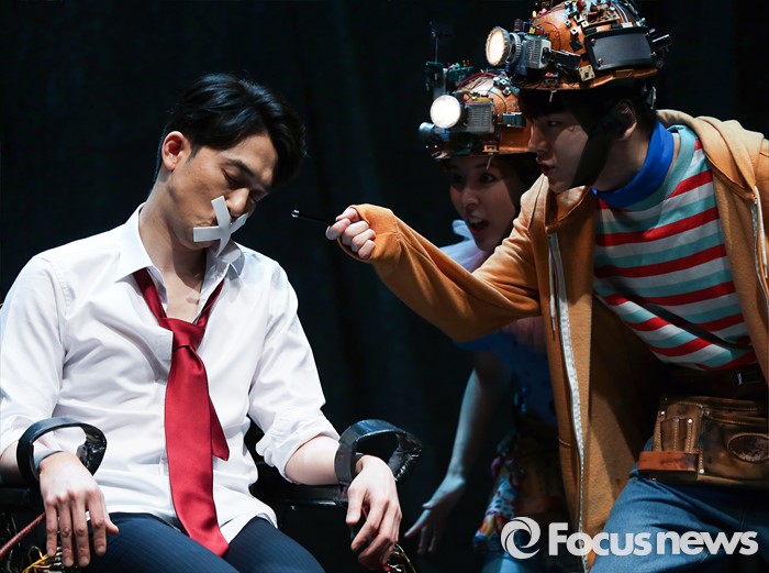 (서울=포커스뉴스) 12일 오후 서울 종로구 아트원씨어터에서 열린 연극 '지구를 지켜라' 프레스콜에 참석한 배우 강필석(왼쪽부터), 함연지, 키가 주요장면을 시연하고 있다.