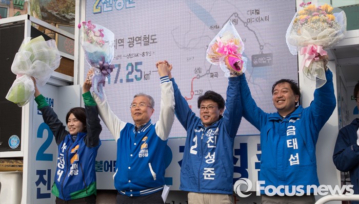 (서울=포커스뉴스) 2016 제20대 국회의원선거를 하루 앞둔 12일 오후 서울 강서구 발산역 인근에서 금태섭 더불어민주당 강서갑 후보, 진성준 강서을 후보, 김종인 비대위 대표 겸 선대위원장, 한정애 강서병 후보가 유권자들에게 지지를 호소하고 있다.