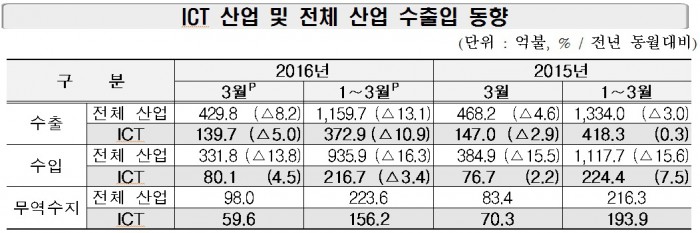 13일 미래창조과학부가 발표한 3월 ICT 수출입 동향은 전년 동월대비 5.0% 감소한 139억7000만달러, 수입은 4.5% 증가한 80억1000만, 수지는 59억6000만달러 흑자로 잠정 집계됐다.