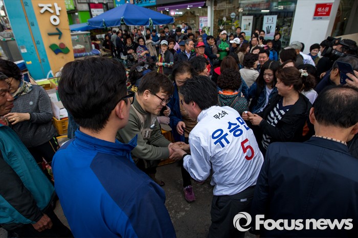 (대구=포커스뉴스) 유승민 무소속 대구 동구을 후보가 12일 오후 대구광역시 동구 방촌시장에서 유세를 마친 뒤 주민들과 악수하며 한 표를 호소 하고 있다.
