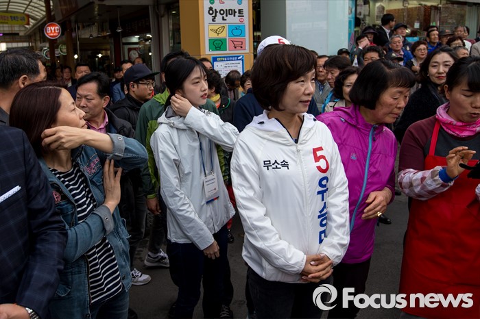 (대구=포커스뉴스) 12일 오후 대구광역시 동구 방촌시장에서 유승민 무소속 대구 동구을 후보 부인 오선혜 씨와 딸 유담 씨가 유 후보의 유세를 듣고 있다.