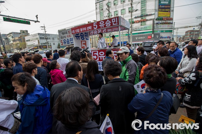 (대구=포커스뉴스) 유승민 무소속 대구 동구을 후보가 12일 오후 대구광역시 동구 방촌시장에서 유세를하며 유권자들에게 한 표를 호소 하고 있다.