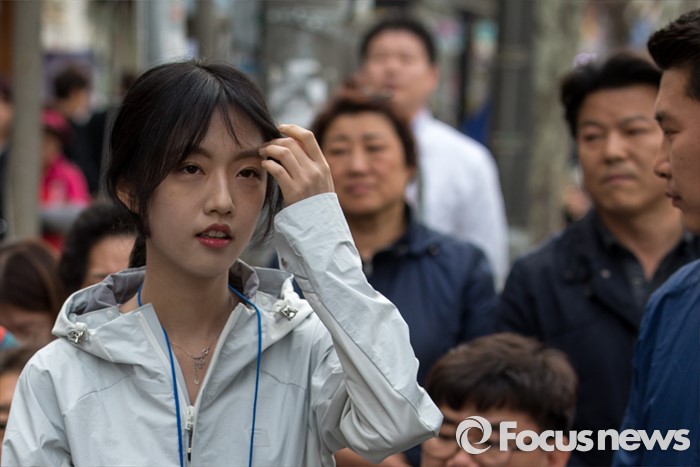 (대구=포커스뉴스) 12일 오후 대구광역시 동구 방촌시장에서 유승민 무소속 대구 동구을 후보 딸 유담 씨가 유 후보의 유세를 듣고 있다.