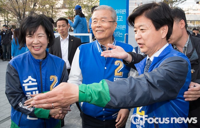 (서울=포커스뉴스) 2016 제20대 국회의원선거를 하루 앞둔 12일 오후 서울 마포구 공덕역 인근 경의선숲길공원에서 노웅래 더불어민주당 마포갑 후보, 김종인 비대위 대표 겸 선대위원장, 손혜원 마포을 후보가 유권자들에게 지지를 호소를 마치고 이동하고 있다.