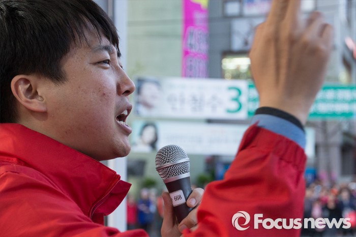 (서울=포커스뉴스) 12일 오후 서울 노원구 GS수퍼마켓 상계점 앞에서 이준석 새누리당 노원병 후보자가 유세를 하고 있다.