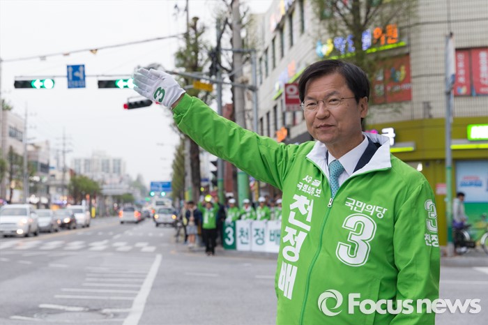 (광주=포커스뉴스) 4.13총선을 하루 앞둔 12일 오후 광주 서구 화정동 염주사거리에서 천정배 국민의당 광주 서구을 후보가 선거유세를 하고 있다.