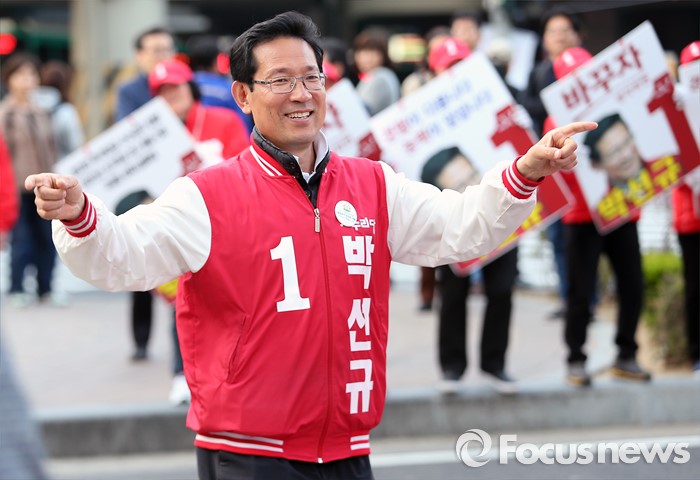 (서울=포커스뉴스) 4.13총선을 하루 앞둔 12일 오후 서울 영등포구 당산역 인근에서 박선규 새누리당 영등포갑 후보가 한 시민과 손을 잡고 있다.