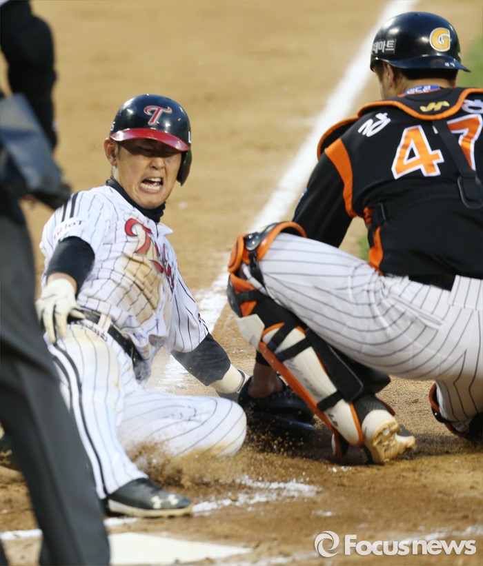 (서울=포커스뉴스) 12일 서울 잠실구장에서 열린 2016 프로야구 롯데-LG 경기 1회말 무사 만루에서 LG 히메네스의 1루쪽 파울플라이 아웃때 3루주자 정주현이 홈으로 뛰어들어 세이프되고 있다.