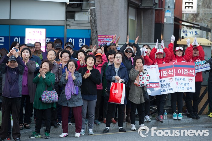 (서울=포커스뉴스) 12일 오후 서울 노원구 GS수퍼마켓 상계점 앞에서 시민들이 이준석 새누리당 노원병 후보자를 지지하는 김무성 새누리당 대표의 발언을 듣고 환호하고 있다.