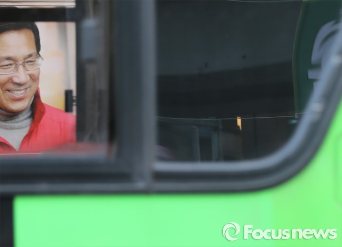 (서울=포커스뉴스) 4.13총선을 하루 앞둔 12일 오후 서울 영등포구 당산역 인근에서 박선규 새누리당 영등포갑 후보가 선거유세를 하던중 버스가 지나가고 있다.