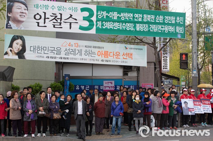 (서울=포커스뉴스) 12일 오후 서울 노원구 GS수퍼마켓 상계점 앞에서 김무성 새누리당 대표가 이준석 새누리당 노원병 후보자 지원 유세를 하고 있다.