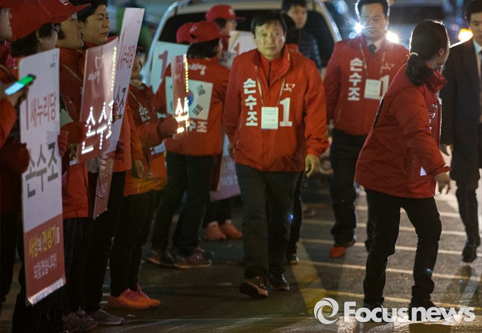 (부산=포커스뉴스) 4.13총선 선거운동 마지막날인 12일 오후 부산 사상구 엄궁초등학교 인근에서 손수조 새누리당 부산 사상구 후보가 지지자들을 향해 발걸음을 옮기고 있다.