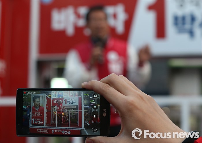 (서울=포커스뉴스) 4.13총선을 하루 앞둔 12일 오후 서울 영등포구 당산역 인근에서 박선규 새누리당 영등포갑 후보의 선거유새를 한 시민이 휴대전화료 촬영하고 있다.