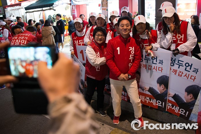 | △ 선거운동원들과 기념촬영하는 정두언 후보 |
