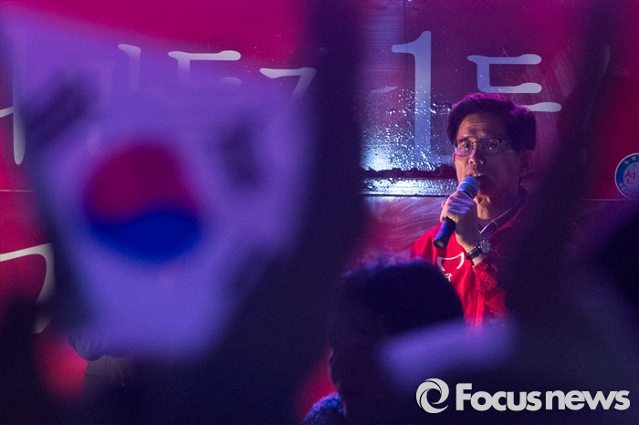 (대구=포커스뉴스) 김문수 새누리당 대구 수성구갑 후보가 12일 오후 대구광역시 수성구 신매광장에서 유세를하며 유권자들에게 한 표를 호소 하고 있다.