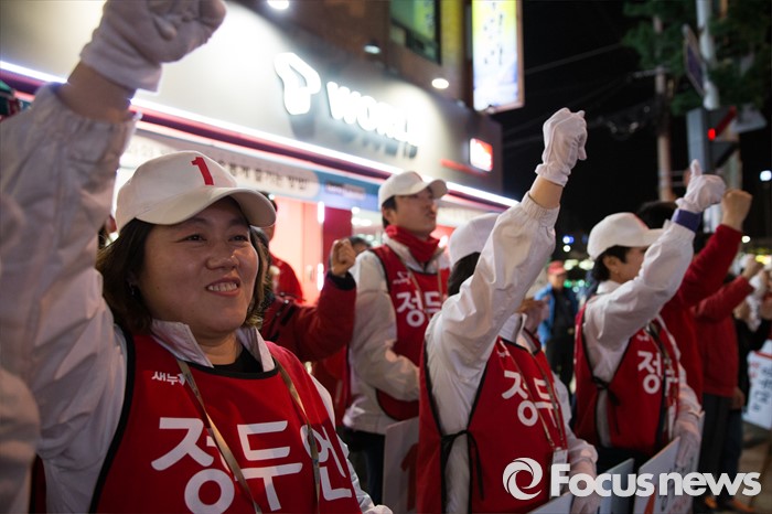 | △ 구호 외치는 정두언 후보 선거운동원들 |
