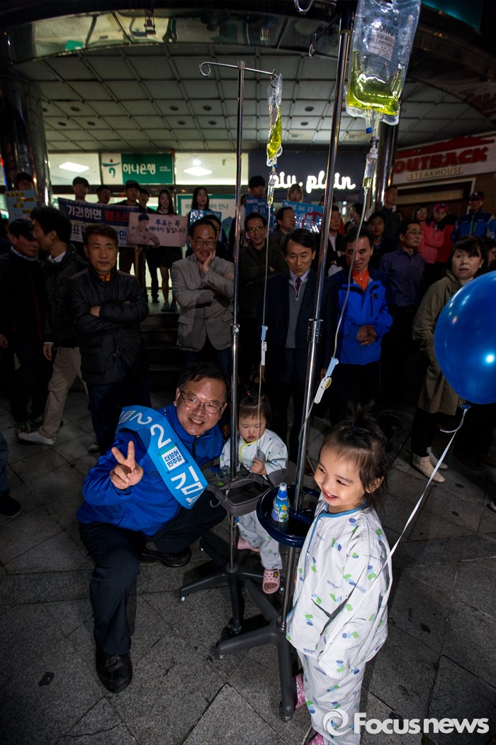 (대구=포커스뉴스) 김부겸 더불어민주당 수성구갑 후보가 12일 오후 대구광역시 수성구 신매네거리에서 유세현장을 찾은 어린이들과 사진촬영을 하고 있다.