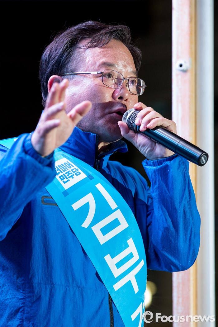 (대구=포커스뉴스) 김부겸 더불어민주당 수성구갑 후보가 12일 오후 대구광역시 수성구 신매네거리에서 유세를하며 유권자들에게 한 표를 호소 하고 있다.