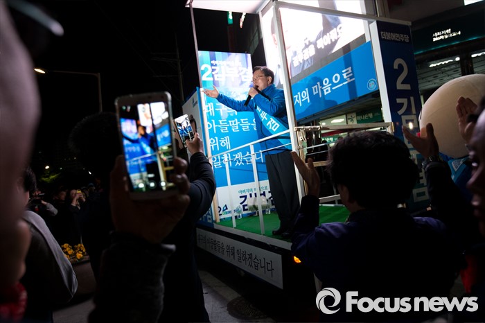 (대구=포커스뉴스) 김부겸 더불어민주당 수성구갑 후보가 12일 오후 대구광역시 수성구 신매네거리에서 유세를하며 유권자들에게 한 표를 호소 하고 있다.