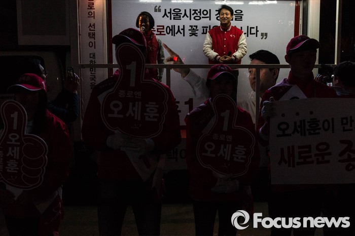 (서울=포커스뉴스) 20대 총선을 하루 앞둔 12일 오후 서울 종로구 경복궁역 일대에서 오세훈 새누리당 종로구 후보측이 막바지 선거유세를 하고 있다.