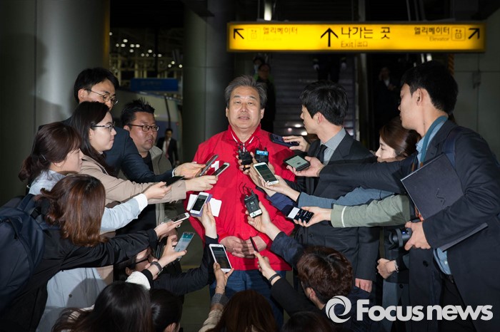 (서울=포커스뉴스) 20대 총선을 하루 앞둔 12일 오후 서울 용산구 서울역 KTX 플랫폼에서 김무성 새누리당 대표가 부산으로 가기 전 기자들의 질문을 받고 있다.