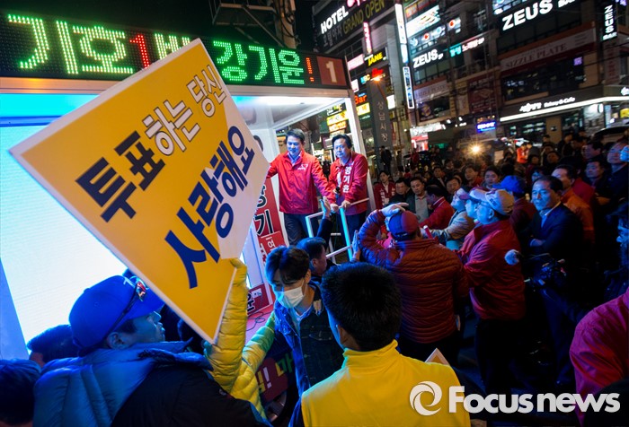 (창원=포커스뉴스) 4.13총선 선거운동 마지막날인 12일 오후 경남 창원시 상남분수광장에서 노회찬 정의당 창원 성산구 후보, 강기윤 새누리당 후보 양측 지지자들이 뒤엉켜 혼잡을 빚고 있다.