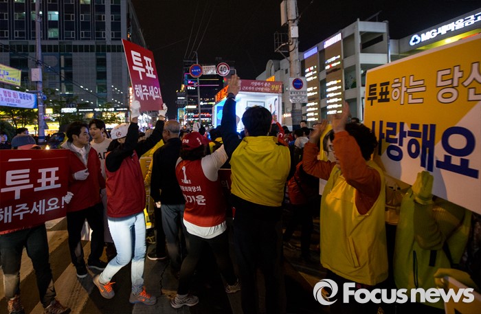 (창원=포커스뉴스) 4.13총선 선거운동 마지막날인 12일 오후 경남 창원시 상남분수광장에서 노회찬 정의당 창원 성산구 후보, 강기윤 새누리당 후보 양측 지지자들이 뒤엉켜 혼잡을 빚고 있다.