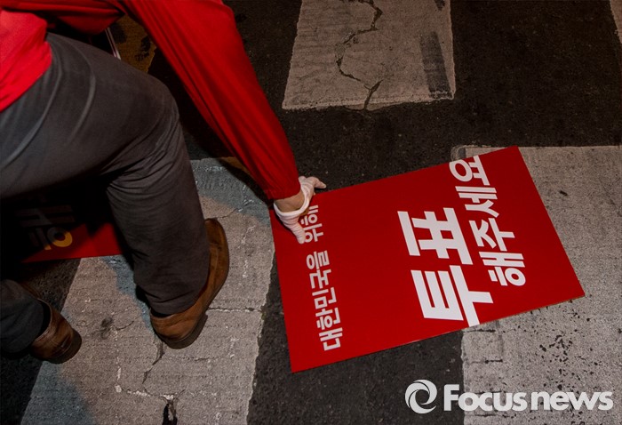 (창원=포커스뉴스) 4.13총선 선거운동 마지막날인 12일 오후 경남 창원시 상남분수광장에서 열린 강기윤 새누리당 창원 성산구 후보 선거유세에 참석한 강 후보 지지자들이 투표를 독려하는 손팻말을 줍고 있다.