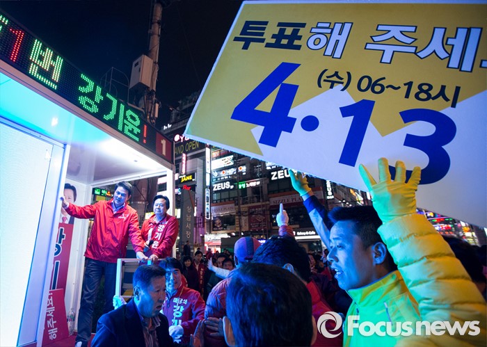 (창원=포커스뉴스) 4.13총선 선거운동 마지막날인 12일 오후 경남 창원시 상남분수광장에서 노회찬 정의당 창원 성산구 후보, 강기윤 새누리당 후보 양측 지지자들이 뒤엉켜 혼잡을 빚고 있다.