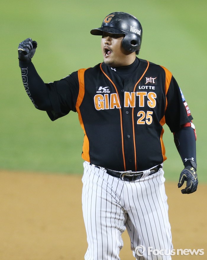 (서울=포커스뉴스) 12일 서울 잠실구장에서 열린 2016 프로야구 롯데-LG 경기 7회초 2사 2루에서 롯데 최준석이 동점 안타를 치고 1루에서 환호하고 있다.