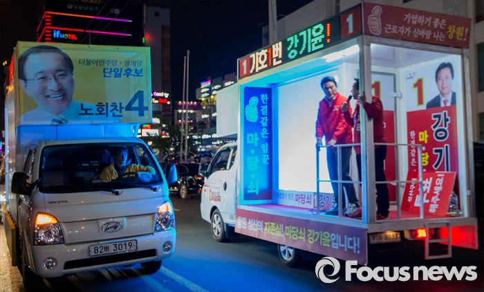 (창원=포커스뉴스) 4.13총선 선거운동 마지막날인 12일 오후 경남 창원시 상남분수광장에서 노회찬 정의당 창원 성산구 후보, 강기윤 새누리당 후보 유세차가 마주 지나가고 있다.
