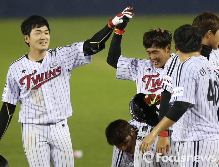 (서울=포커스뉴스) 12일 서울 잠실구장에서 열린 2016 프로야구 롯데-LG 경기 연장 10회말 1사 만루에서 중견수 희생플라이로 경기를 끝낸 LG 정주현을 이형종(왼쪽)이 축하해주고 있다.