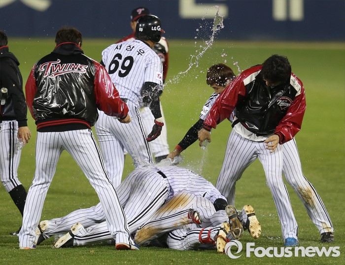 (서울=포커스뉴스) 12일 서울 잠실구장에서 열린 2016 프로야구 롯데-LG 경기 연장 10회말 1사 만루에서 중견수 희생플라이로 경기를 끝낸 LG 정주현을 선수들이 물을 뿌리며 환호하고 있다.