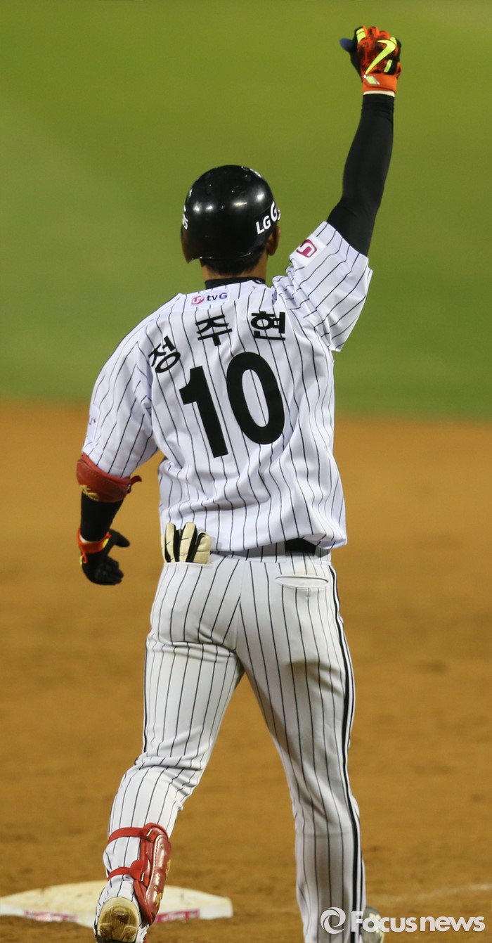 (서울=포커스뉴스) 12일 서울 잠실구장에서 열린 2016 프로야구 롯데-LG 경기 연장 10회말 1사 만루에서 중견수 희생플라이로 경기를 끝낸 LG 정주현이 주먹을 쥐며 환호하고 있다.